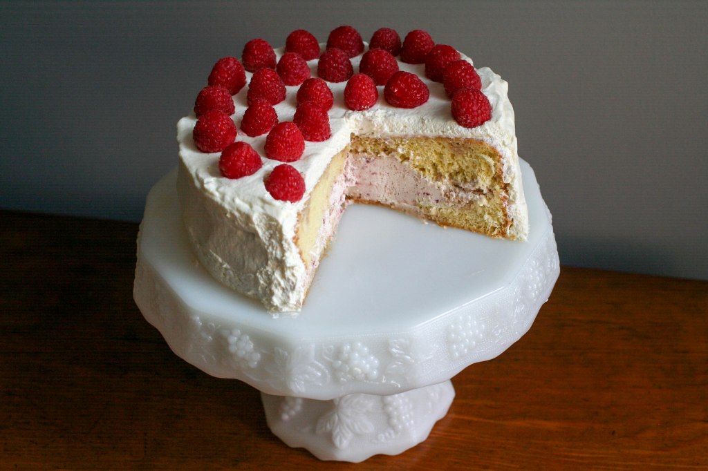 To assemble cake, put top layer–cut side up–on plate and prick with a toothpick all over, then sprinkle with half or one-third raspberry liqueur or juice. Cover with a layer of the cream and jam mixture: use half if you’re making three layers, or all if only two layers. Add middle layer if using, also cut side up, prick and sprinkle with liqueur, then add another layer of cream and preserves. Finish with top cake layer, cut side down, and more liqueur. Once cake is assembled and filled, frost all over with sweetened whipped cream. Decorate with fresh berries just before serving.